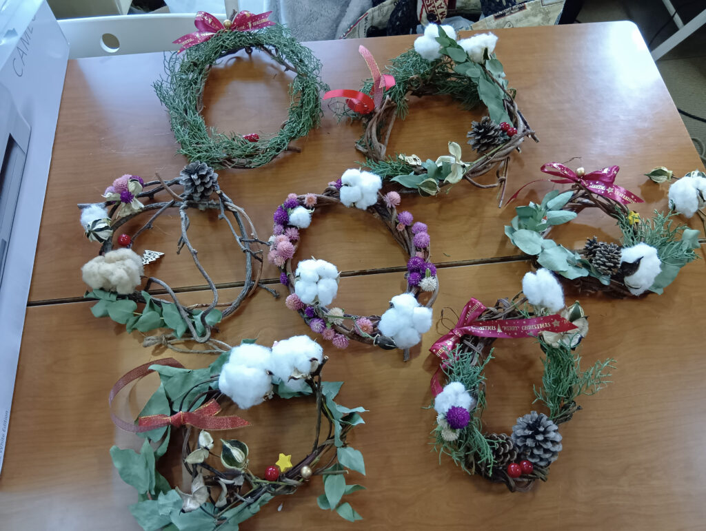 リースの形はさまざまで、皆さんにお好きな形を選んでいただきました。「千日紅かわいいね」「この木の名前は何だろう?」「バランスを取るのが難しいね」など、会話を楽しみながら、時には集中して無言になる場面もあり…気づけば1時間半があっという間に過ぎていました。